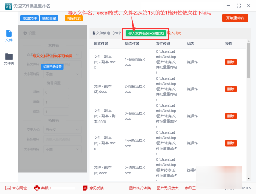3、点击【导入文件名】绿色按钮,将事先准备好的文件名导入到软件中(要求,excel格式,文件名从第一列的第一格依次往下填写),导入的文件名会显示在新文件名这一列下面。