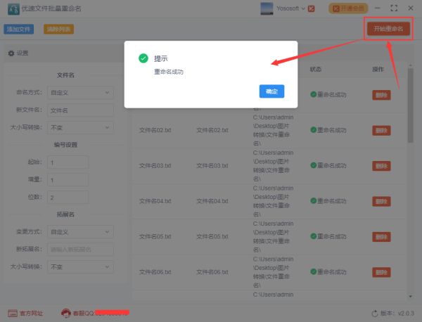 3、设置好了之后就可以点击【开始重命名】按钮,启动软件处理程序了。当弹出“重命名成功”的提示框说明软件处理完成。