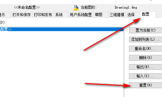 4、进入选项页面后,点击进入配置页面,然后点击配置页面中的重置,把CAD界面重置就可以了。