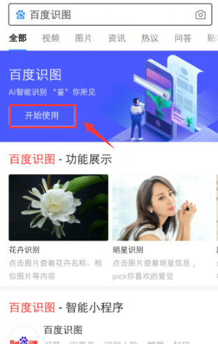 3、搜索成功后,在百度识图下方,点击【开始使用】,如下图所示: