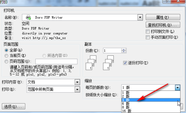 2、按Ctrl+P打开“打印机设置”,在里面点击“每页的版数”--设置为“4版”或需要的版数即可。