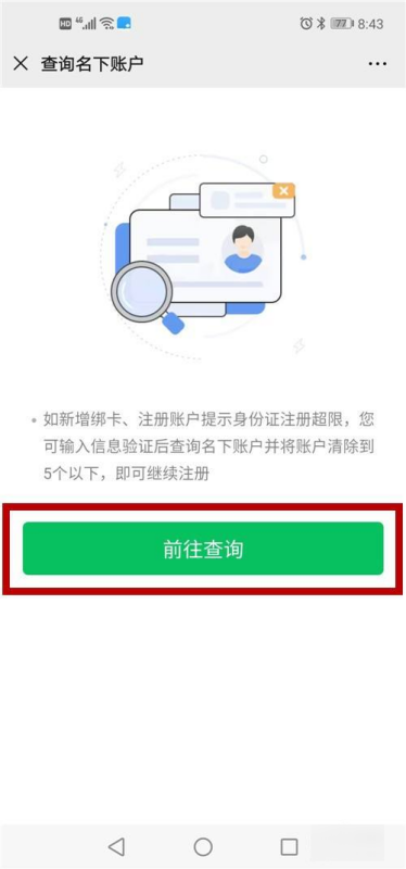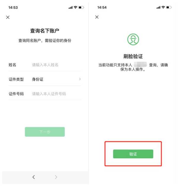 第3步:根据页面提示,输入姓名、身份证号,点击下一步。系统人脸验证后,即可查询您的身份证名下注册的账户信息。