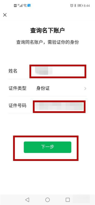 10、输入姓名、证件类型、证件号码,选择【下一步】。
