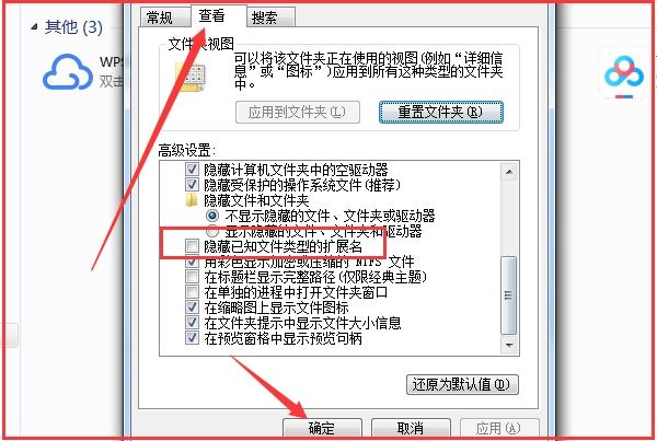 3、最后在查看的页面将【隐藏已知文件类型的扩展名】前面的方框给进行勾选,接下来点击【确定】就能实现电脑隐藏文件的扩展名的功能了。
