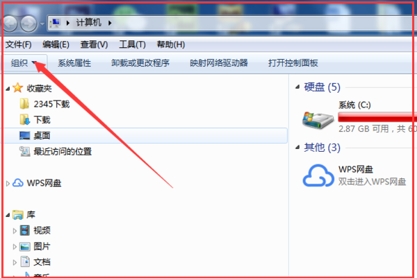 1、首先在笔记本电脑的计算机页面点击下方的【组织】。