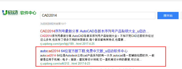 发不了链接了,只好截图了,百度一下u启动软件下载站,或者直接手打rj.uqidong进入网站搜索一下CAD2014就能下载,如图: