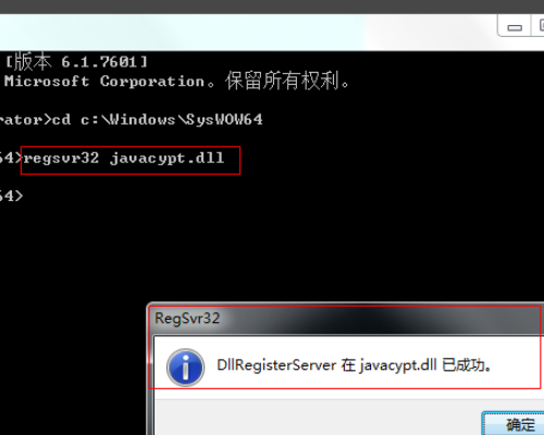 4、然后在DOS控制台继续执行命令regsvr32javacypt.dll,回车后显示执行成功。一般执行到此,此问题就可解决,可重新对VC++6.0进行安装。为保险起见,可继续执行命令regsvr32javasign.dll,回车显示执行成功。