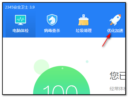 1、首先在电脑上下载并安装“2345安全卫士”,然后点击进入软件,在此软件的页面中点击上方的“优化加速”功能选项。