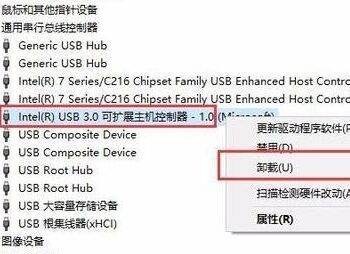 3、打开通用串行总线控制器设置选项后,我们右键单击“ USB3.0可扩展主机控制器”,然后在弹出菜单中选择“卸载”按钮。