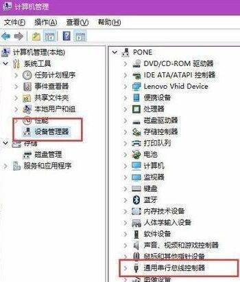 2、在计算机管理页面上,单击页面左侧的“设备管理器”选项,双击,然后在页面右侧找到“通用串行总线控制器”选项。