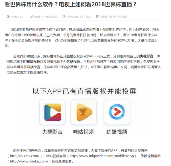 可以看世界杯直播的视频软件APP只有三款,分别是央视自己的央视影音、中国移动旗下的咪咕视频以及网络视频平台优酷视频。