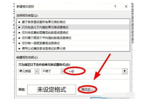 8、回到“新建格式规则”对话框中,把条件范围中默认的绝对引用改为相对引用(也就是把格式中的$符号删除)。单击“格式”,对对应单元格内容不同的文字格式进行设置。