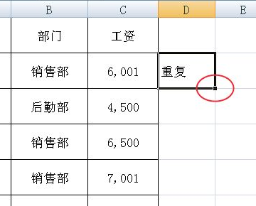 8、这时候选择D3单元格,就会发现D2单元格里显示重复二字,如图。