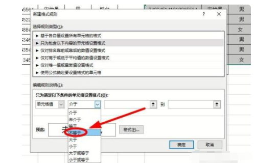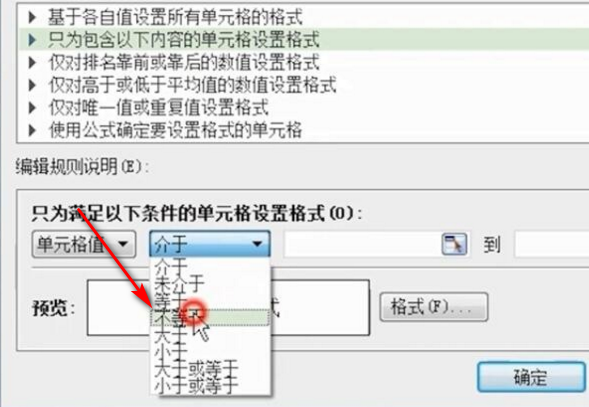 6、在“编辑规则说明”下面的“介于”后面有个下拉按钮,单击后,在下拉列表中选择“不等于”单击。
