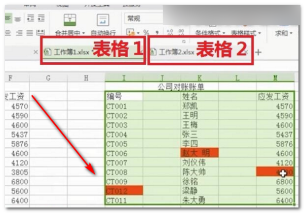1、首先打开两个excel文档,分别是工资表和工资表1,需要找出两个表格不同的数据,如图。