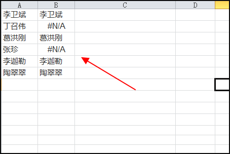 4、然后结果为#N/A的即为表一中存在而表二中不存在的名字。