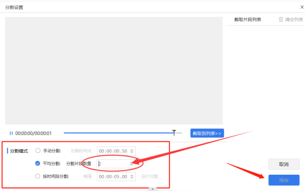 2、依旧根据界面的文字提示来添加文件,添加成功后在‘分割设置’中选项‘平均分割’并在分割片段数量中输入2,之后截取到列表并点击‘保存’即可。