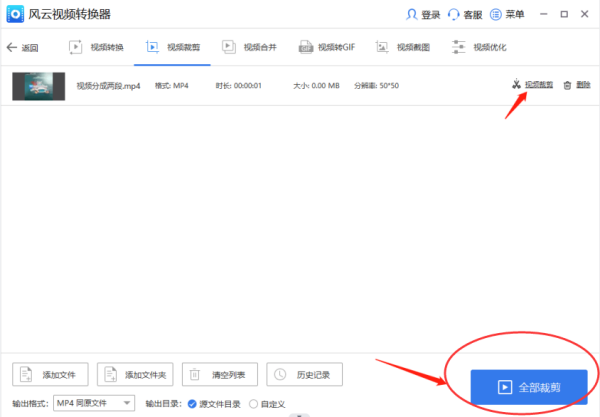 3、选取视频内容后,会让我们选择‘输出格式’根据自己的需求来进行选择即可,最后点击‘全部裁剪’。裁剪完成后,再用以上的操作把视频中剩下的内容裁剪下来,就可以对视频分成两段了。