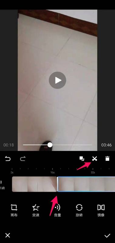 4、选择点击视频,拖拉视频上的进度条到需要裁剪的位置,再点击上方的剪刀符号。