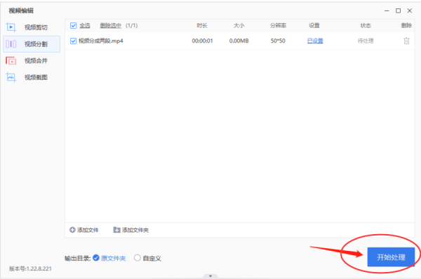 3、保存完成后,最后点击‘开始处理’按钮就可以对视频进行分割了。