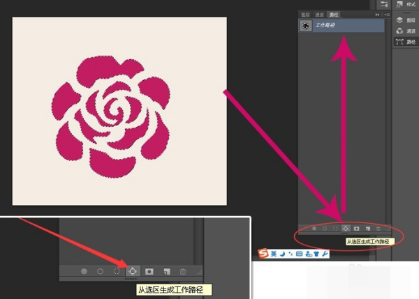 3、点击路径面板,在路径面板最下方,点击第四个图标:从选区生成工作路径;