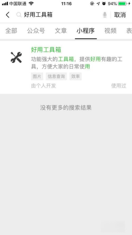 2、进入微信,搜索小程序“好用工具箱”,点击进入
