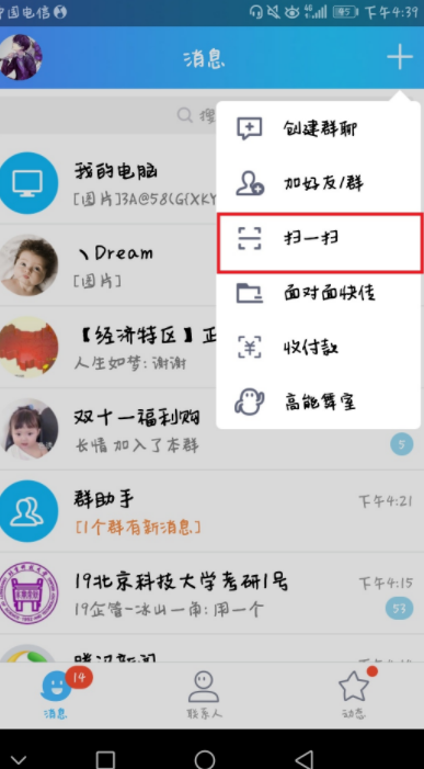 2、打开手机上的QQ,点击右上角的加号,找到扫一扫点击,如图所示。