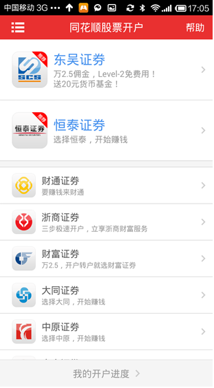 2.选择一家证券公司进行开户,按照系统提示经历手机验证、证件拍摄上传、营业部选择、视频认证等