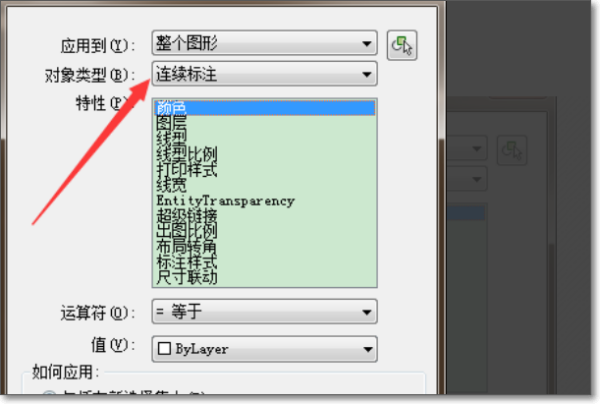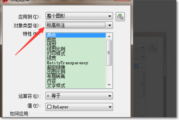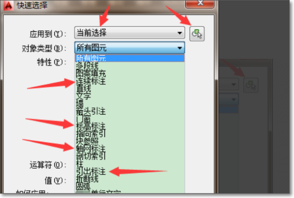 3、应用到默认选择整个图形,如果针对某个图框内的内容删除标注可点击整个图形右侧按钮开始圈选快速选择区域;默认对象类型所有图元,点击下拉三角,其中包含连续标注、标高标注、轴网标注和引出标注。