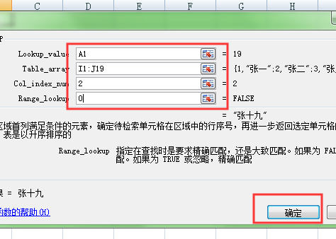 四、第一栏输入A1,第二栏输入“第一步的两列”,第三栏输入“2”(返还第二列),第三栏输入“0”(精准查询),点击“确定”。