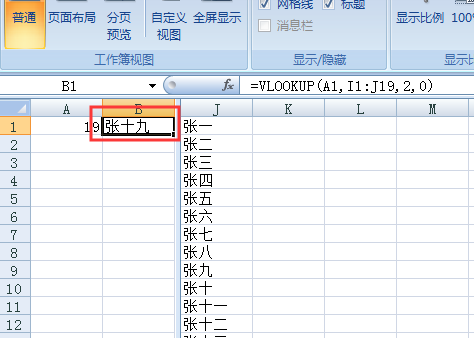 五、这时就可以在B1单元格内计算出A1单元格在两列辅助列内对应的第二列名字。