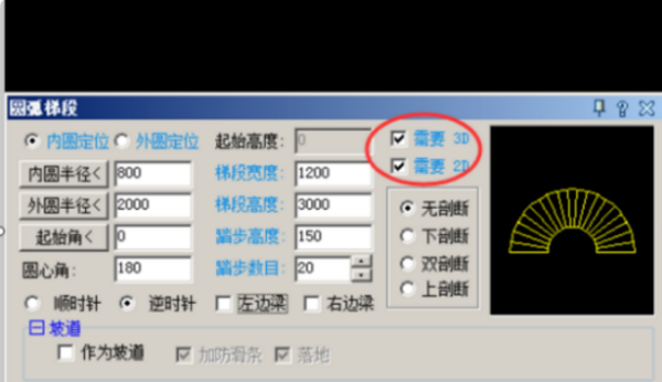 2、接下来需要根据个人需要在弹出的圆弧楼梯中设置需要的相应参数,并在需要3D上点对勾,选择参数的大小可以参照所给定的大小标准进行。