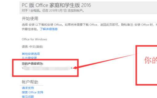 6、点完后,最后就在这个页面,有一个您的产品密钥,点开,这就是你的office的密钥序列号。