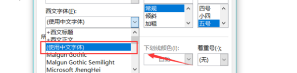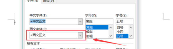 3、进入后点击西文字体后的下箭头。