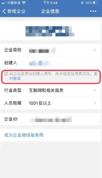当我们的企业未进行认证,企业名字前会出现一个红色问号,容易引起客户对企业的质疑和不放心。当企业微信完成认证后,在【企业信息】的页面会出现“已认证”的绿色标识,增加企业的可信度,提高客户对企业的信任感。
