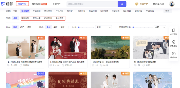 制作婚礼电子相册的软件,推荐使用【旺影视频模板】。旺影是一款拥有海量视频模板的网站,支持一键将照片生成为视频,无需任何AE、PR剪辑基础,小白就能快速创作一个婚礼创意电子相册视频。