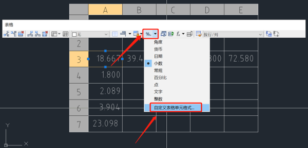 步骤1:在浩辰CAD软件中打开需要编辑的图纸后,可以单击CAD表格中需要修改数值精度的单元格(单个或多个),在弹出的【表格】对话框中点击【数据格式】按钮后,点击下拉菜单中的【自定义表格单元格式】。