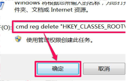 6、然后,打开运行框页面后,接着在框里面输入cmd reg delete "HKEY_CLASSES_ROOT\lnkfile" /f 这条命令,按‘确定’,如下图所示。