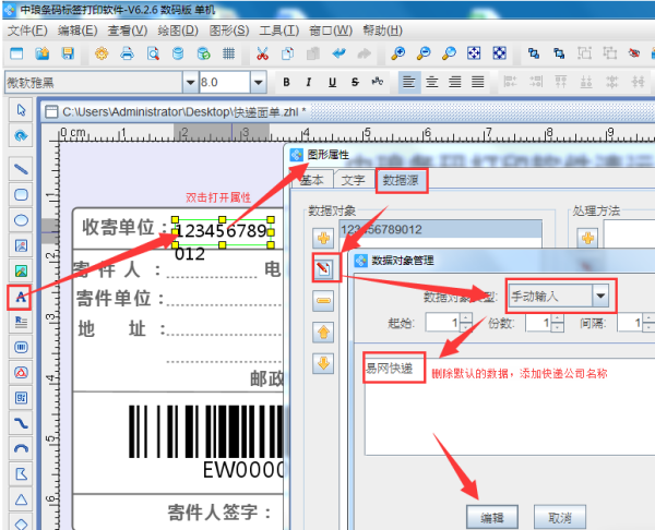 2.点击中琅条码标签打印软件左边工具栏的“A”图标,在快递单上添加一个普通文本,双击普通文本打开“图形属性”,在“数据源”中修改默认的数据,手动添加快递单公司的名称。如下图: