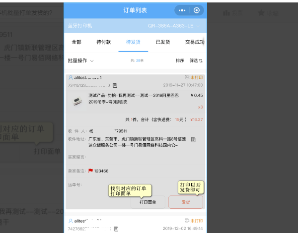 5、店铺后台所有待发货的订单会自动同步到该小程序待发货页面,选中订单(支持多选)打印,打印面单后点击发货,单号自动同步到店铺后台。