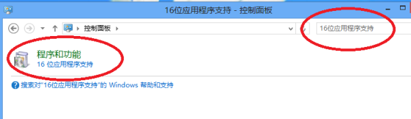 2、在控制面板的右上角搜索”16位应用程序支持“,如下图所示: