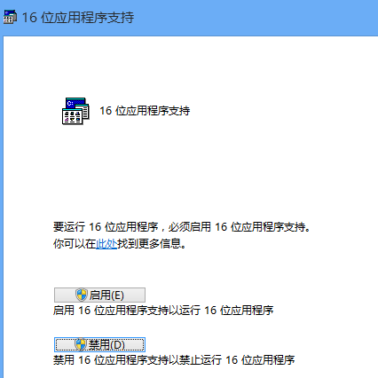 3、双击打开”16位应用程序支持“,点击 ”启用“即可,如下图所示: