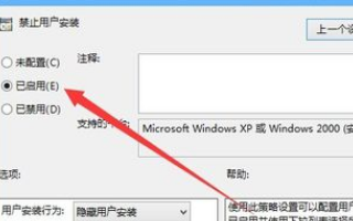 4、双击打开 "无用户安装" 编辑窗口, 您可以看到该项目设置为 "已启用", 这是导致软件无法正确安装的原因。