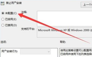 5、我们将此项目设置为 "未配置" 或 "禁用", 然后单击 "确定" 按钮保存退出, 以便以后可以正常安装软件。