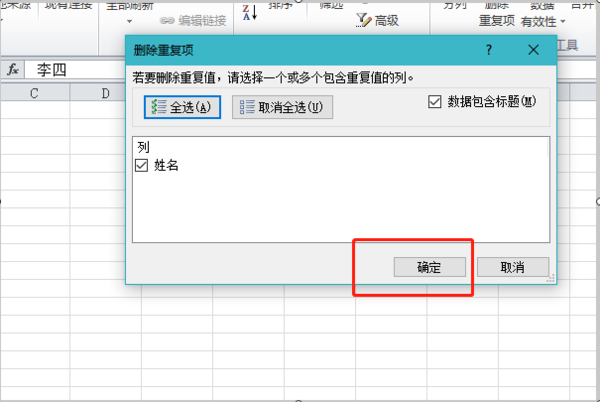 3、然后我们在弹出来的窗口中点击“确定”即可删除重复的名字。