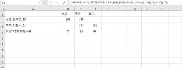 B2=IFERROR(MAX(--TEXT(MID($A2,FIND(B$1,$A2)+LEN(B$1),ROW($1:$9)),"#;;0;!0")),"")
