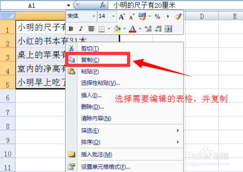 因为excel表格版本比较多,现以excel2007版为例;首先打开需要编辑的excel表格,选择需要编辑的表格,再点击鼠标右键,选择“复制”,或者用复制功能快捷键“Ctrl键”+”c键“代替;如图所示;