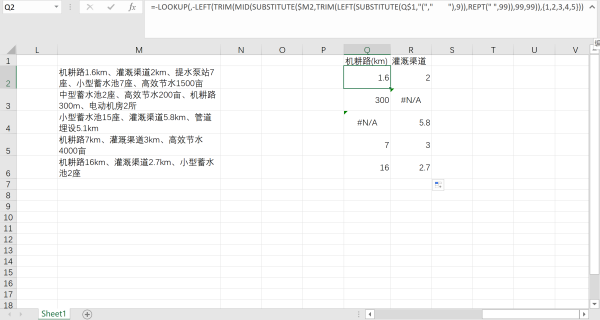 =-LOOKUP(,-LEFT(TRIM(MID(SUBSTITUTE($M2,TRIM(LEFT(SUBSTITUTE(Q$1,"("," "),9)),REPT(" ",99)),99,99)),{1,2,3,4,5}))