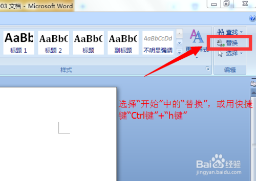 选择word文档最上方的功能菜单“开始”中的“替换”按钮,或者用替换快捷键“Ctrl键”+“h键”代替,如图所示;