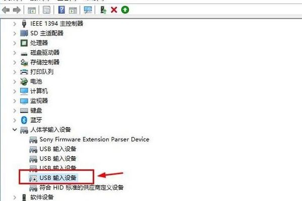 4、在人体学输入设备列表中就可以看到usb输入设备,这些都是鼠标或者键盘设备,选择其中有向下箭头表示的usb输入设备选项。